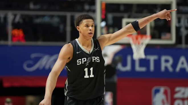 可在今年的新秀中,更多的则是和杨瀚森一样,在赛场上显得非常挣扎,完全找不到节奏的愣头青,就比如马刺队的卡特-布莱恩特。在进入联盟之前,卡特-布莱恩特的身体天赋可要比杨瀚森高出一大截,2米03的身高配合2米15的臂展,在动作速率方面却不输后卫球员。而且弹跳能力和爆发力更是顶级,在联合试训时,卡特-布莱恩特就曾跳出100cm的垂直弹跳。而在大学的助跑摸高中,他更是跳出了3米94,超过记录仪测量尺寸的夸张高度。